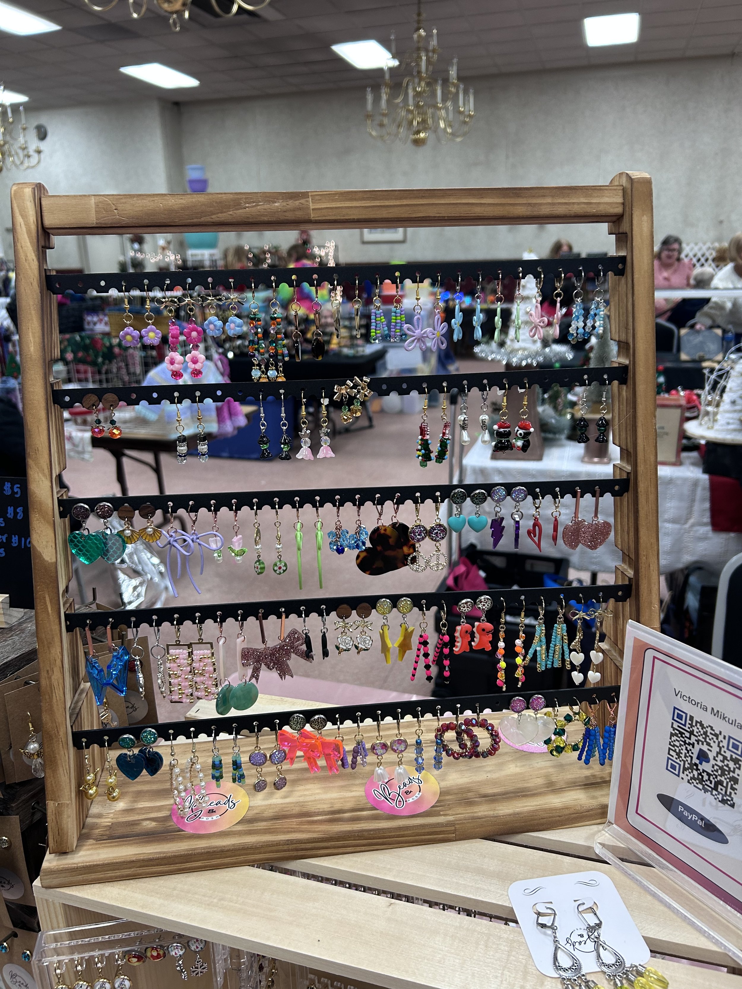 This wood design rotating jewelry display tower has been a staple at my shows; I’ve used it to display earrings, keychains, and hair accessories. But I think in the future I’m going to use it for the cabochon-style earrings I had on the folding earring display because, since each hook holds multiples, I can put the same styles together while saving space. And space is a premium for vendor shows.