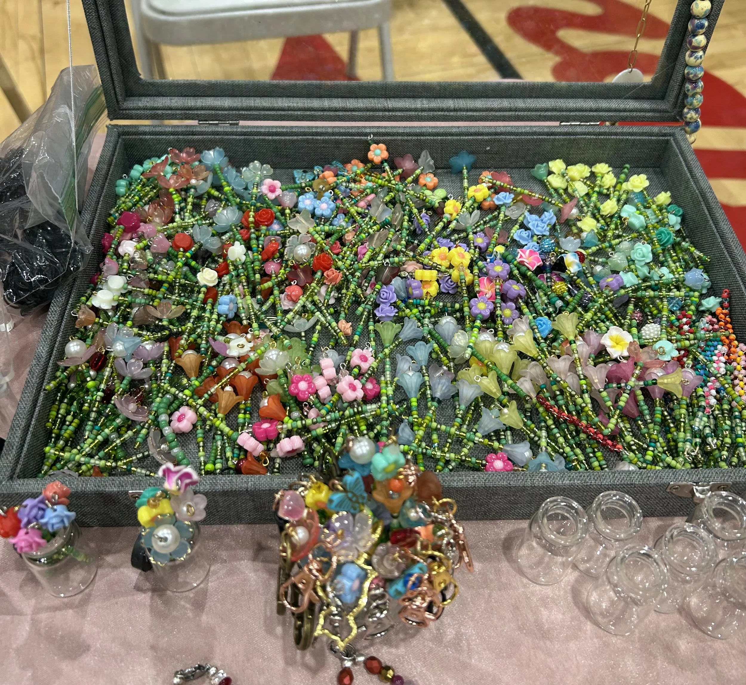 This acrylic riser stand gives me some height and is a must-have for my shows. Currently, I use it to display some of my beaded flower products (pots, mini vases, and magnets), and next to it, I keep my case of single beaded flowers and keychains.