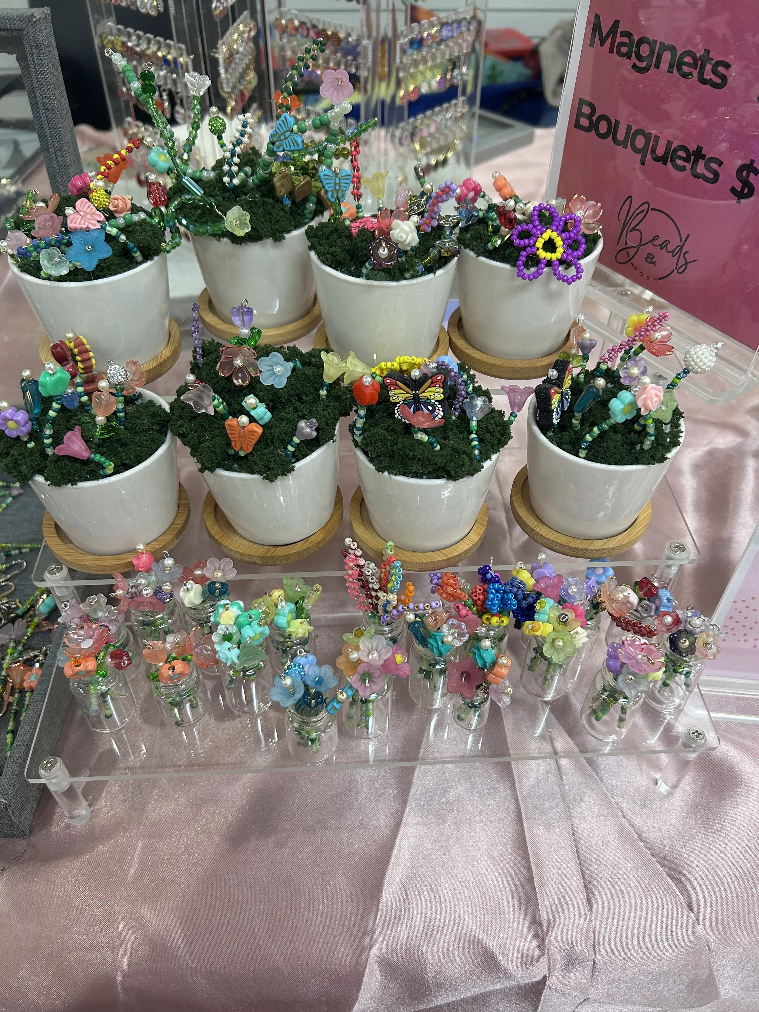 My beaded flower items are a mix of build-your-own and already made, so I like to keep everything together. You can build your own keychain bouquet or mini vase. At my last show, I had several people interested in building their own magnet. I hadn’t offered that because I glue the flowers into the vase, but I think I’m going to have to start offering it. The real question is do I glue a magnet to a mini vase like I have been or do I buy them already made? (Considering I have like 40 magnets, I’ll be making them at least to start).